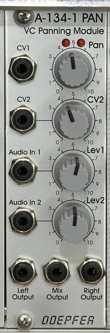 A-134-1 has an audio input with attenuator for each VCA. If the audio input of VCA2 is not used the audio input of VCA1 is connected with audio in of VCA 2, i.e. the sockets are "normalled". The module has three audio outputs: Left Output (VCA1), Right Output ( VCA2) and Mix. For Panning applications the outputs Left Out and Right Out are used. If the module is used as as Crossfader the Mix Output functions as output.