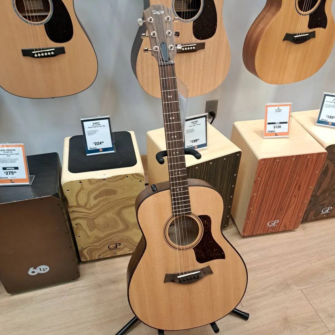 The GT borrows the basic body curves of the Grand Orchestra (Taylor's largest body style), but they're scaled down. The width at the lower bout (15 inches) is nearly the same as the Taylor Grand Concert, but the GT's body length is shorter. Solid-wood construction and ultra-thin finish optimize the tonal response.