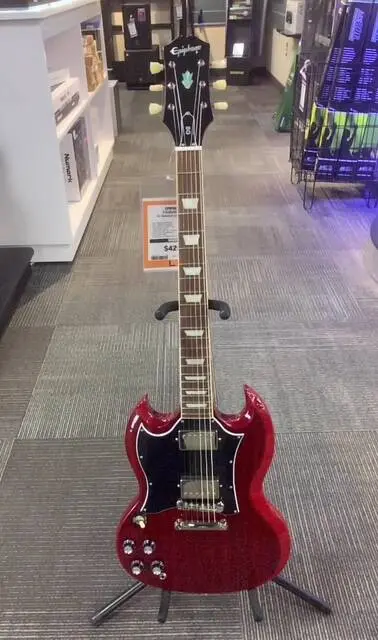 The Epiphone SG Standard from the new Inspired by Gibson Collection, recreates the legendary 1960s classic that powered the first generation of hard rock and heavy metal bands including The Who, Cream, AC/DC, and Black Sabbath. The guitar features the historic SG profile with "batwing" pickguard, a pair of Epiphone's Alnico Classic PRO™ humbuckers, and 18:1 ratio Epiphone Deluxe Tuners. This Epiphone Inspired by Gibson Original model also has the Kalamazoo headstock, rolled neck for a comfortable feel, GraphTech® NuBone™ nut, era-appropriate wiring, and CTS pots.