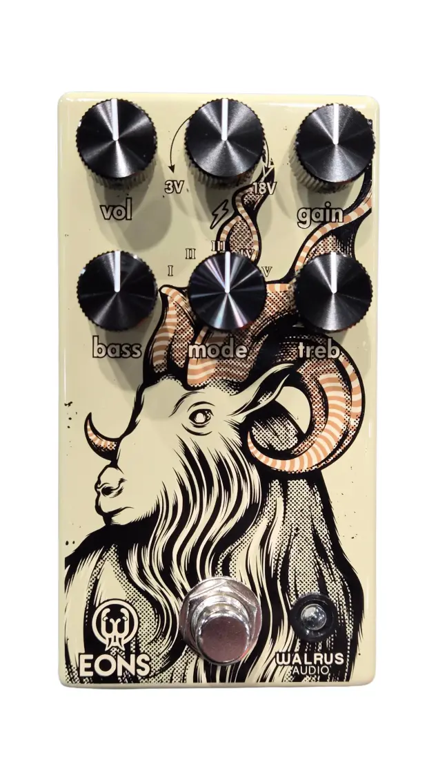 Eons is a five-state fuzz capable of massively thick sounds ready to test the limits of any amp's grill cloth. Use the Voltage (lightning bolt) knob to crank up to 18 volts into the pedal's circuit for massive, open fuzz sounds, or choose to starve it down to 3 volts for spatty, gated fuzz. Experiment with the Voltage and Mode knobs for nearly endless styles of fuzz tones. Find vintage-inspired sounds emanating from the stages of Woodstock to chaotic three-chord punk rock. Eons is ready for a fight.