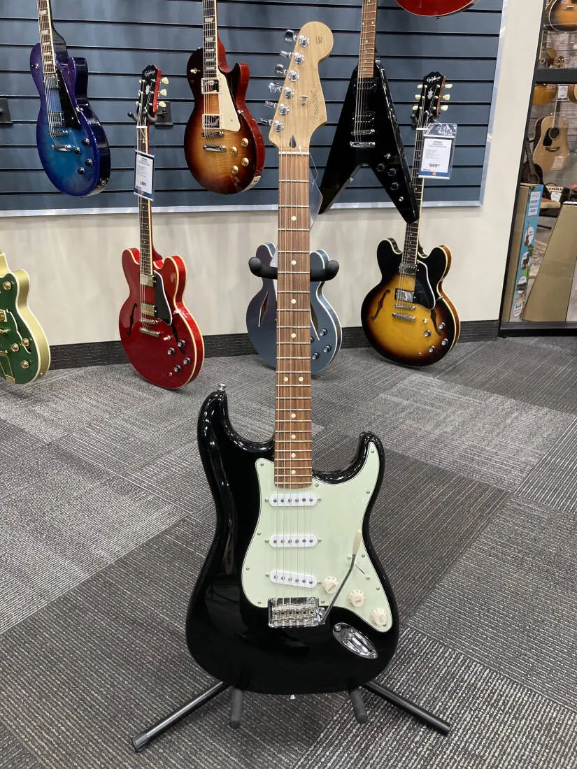 The "Modern C"-shaped maple neck's comfortable contours and smooth finish are ideal for almost any playing style. By adding a 22nd medium jumbo fret to the contemporary 9.5"-radius fingerboard Fender made it easier to express yourself musically. The updated 2-point tremolo design has smoother travel for enhanced playing feel while simultaneously giving you rock-solid tuning stability since there's less friction against the posts. Other features include master volume and tone controls, a 5-way pickup switch, 3-ply pickguard, synthetic bone nut, dual-wing string tree, sealed tuning machines and four-bolt "F"-stamped neck plate that marks this instrument as the real deal - as Fender as it gets.