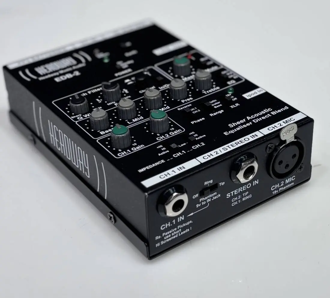 Here's the new, (much sought after) Headway upright bass preamp. The EDB-2 is a 'mega multi-purpose and compact external preamp' and so far, nothing out there can rival its capabilities and quality of sound. Some of its capabilities include: A 'refined' call "A" input and Pro Audio IC components, low in noise, effective 5 bank graphic EQ in both 1 and 2 channels, offers a 0 gain up to 32dB gain. Has versatile inputs offering switchable 3 way Impedance switching on Ch1 or Ch2 etc... This is a very substantial, well made preamp.
