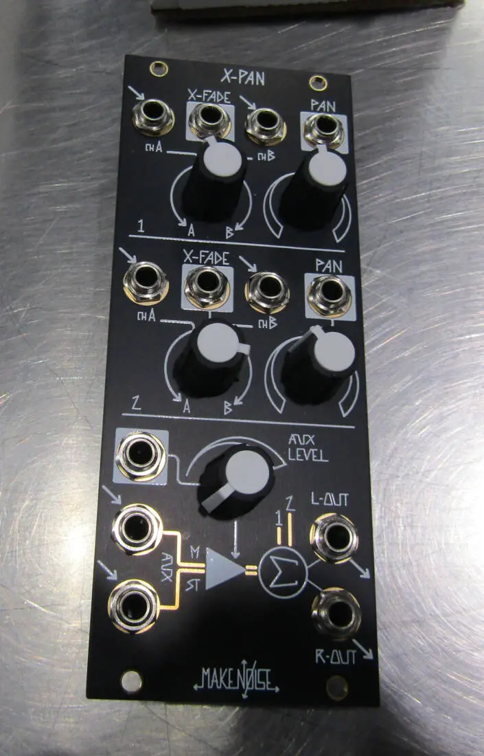 The X-PAN music synthesizer module is a compact and powerful 5 channel Voltage Controlled Stereo Mixer with Low Noise and High Headroom allowing for creation of complex panoramic audio imagery in just 10hp. X-PAN is highly responsive to control signals allowing for exploration of the fluctuating stereo sidebands possible with Audio Rate Crossfading and Panning. X-PAN is Direct coupled for use as a CV Processing and Routing toolbox.