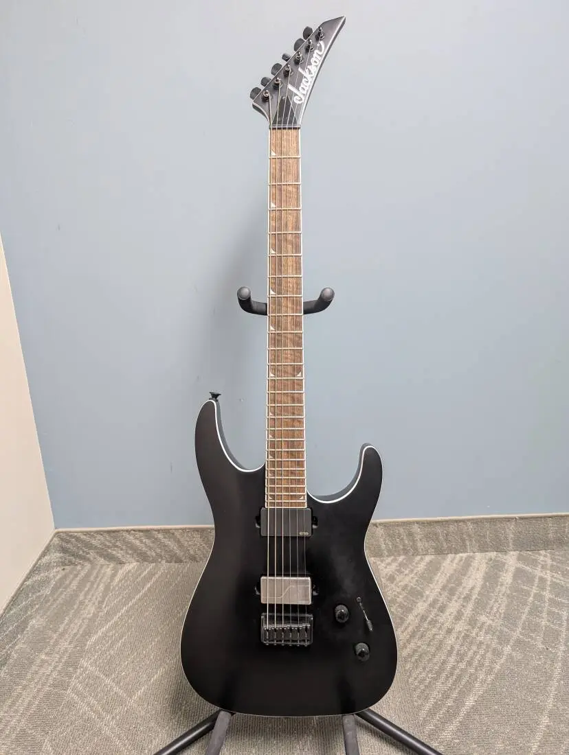 The thundering X Series Soloist™ SLA6 DX Arch Top Baritone comes in Satin Black with black hardware and a Jackson pointy headstock.