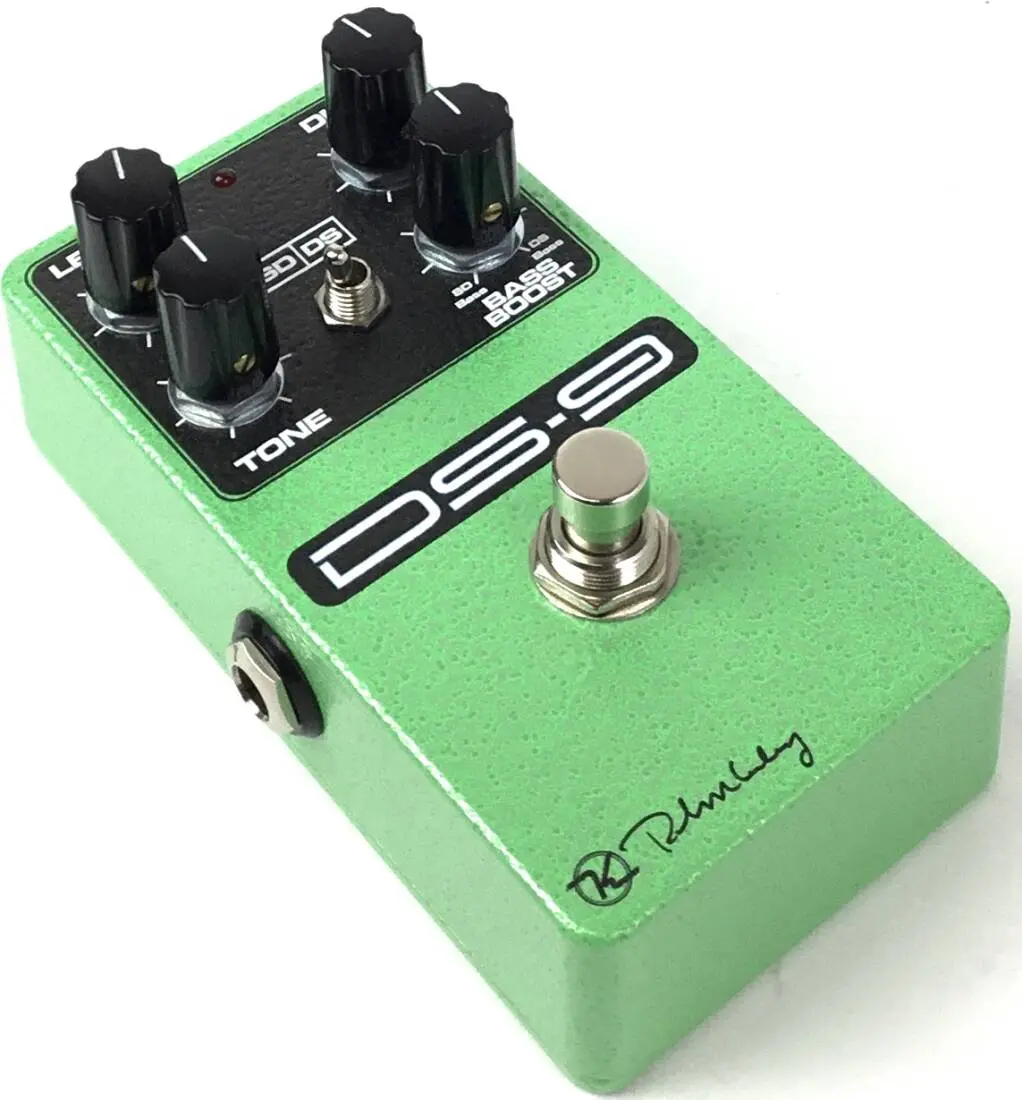You now have the famous SD Sonique Distortion and the DS Orange Distortion in one box, the Keeley DS-9 Distortion. These are very similar styles of distortions. The Orange pedal had more gain because it has the added transistor gain stage. The Sick Green pedal had a higher bass output that made tons of famous players happy because there was no low-end cut off. It suffered from low output volume (missing the transistor) and a limited tone control. In fact, many players can be seen using the Green Meanie with the Level and Gain cranked and the Tone completely off! Since 1978 The Orange Distortion box has been considered a roach. Nothing will kill it, and they are everywhere. It's easy to get a good Marshall-esque type of sound from this pedal, it does hard rock great. What we did with the Keeley DS-9 Distortion is combine the two boxes via a toggle switch. The toggle controls a relay that moves circuit elements around to give you accurate recreations of those pedals. We also gave you a Bass Cutoff Control to create new sounds by varying the amount of low end gain you want.