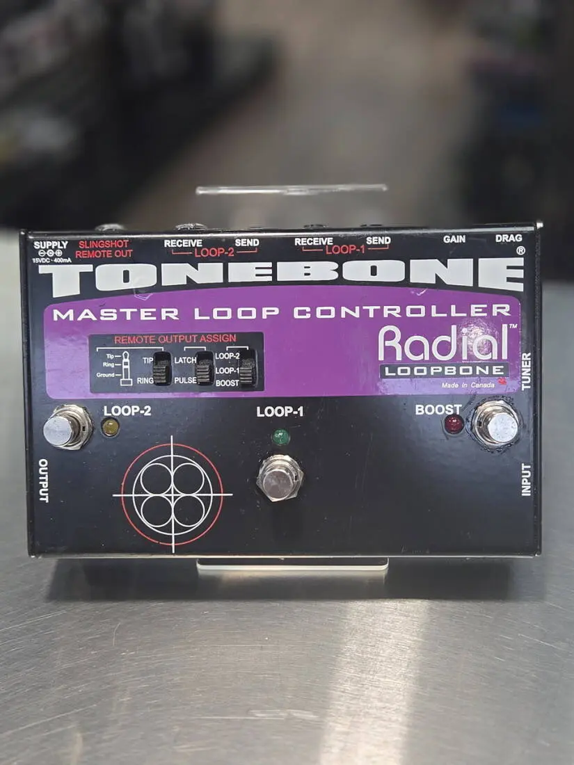 To ensure the natural tone of your instrument is maintained, no signal degrading op-amps or chips are used only 100% discreet components and our highly acclaimed Class-A circuit, which combine to achieve Radial's trademark transparency and exceptional dynamics. The Loopbone also features Radial's unique Drag control pickup load correction circuit that allows the restoration of a proper 'amplifier' impedance load which is lost when you plug a guitar into effect pedals or other buffered devices. In addition, the Loopbone brings even more to your pedalboard a separate 'always-on' tuner out circuit that allows 'on-the-fly' tuning without adding noise or load and perhaps the most innovative feature of all, Slingshot remote switching. Slingshot allows switching of amp channels or other features, even other devices such as the Radial Headbone or Cabbone switchers, from the Loopbone. Check out 'The Power of Slingshot' for details.
