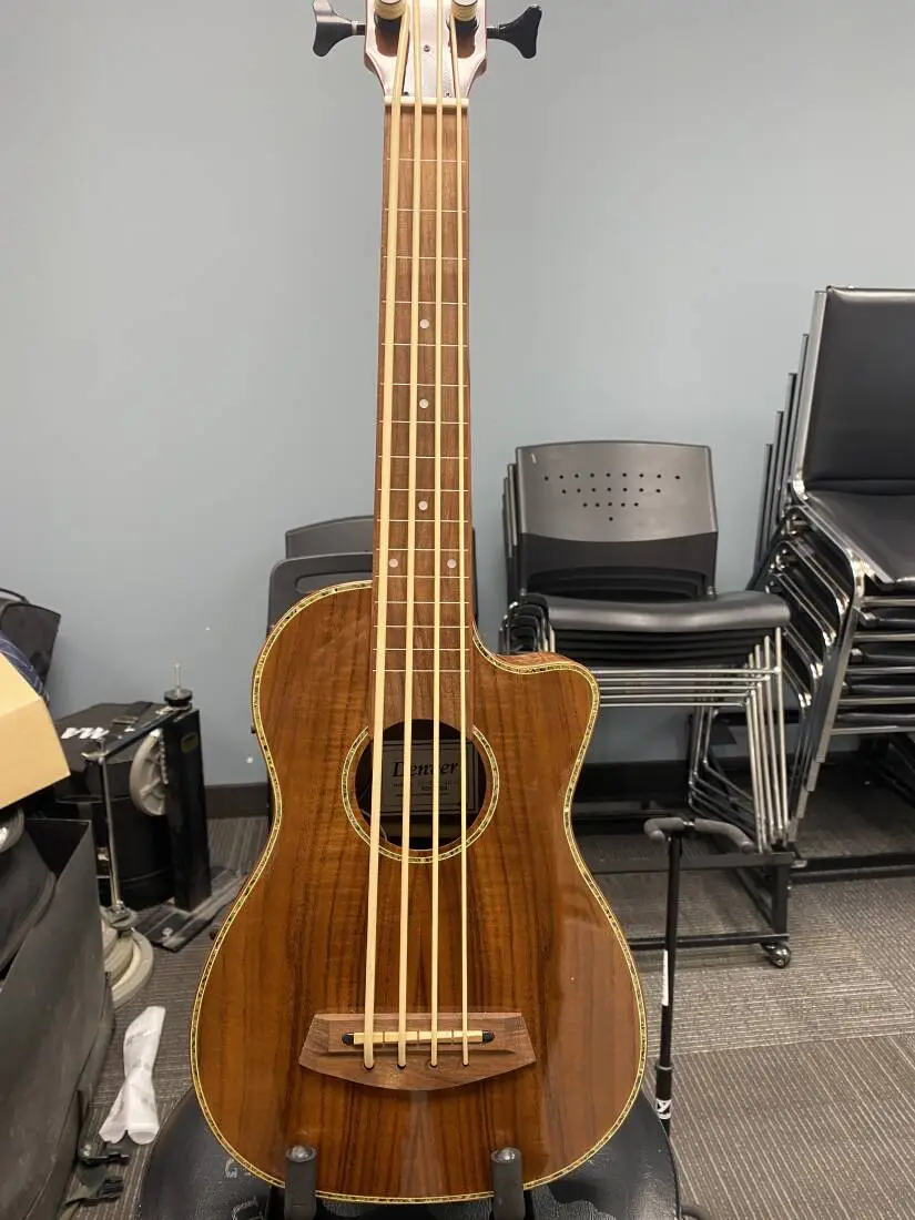 Denver bass ukes come by their good looks honestly. Featuring an under saddle transducer pickup with preamp and a built-in tuner, they are as good to look at as they are to play. Comes with Aquila strings and a gig bag.