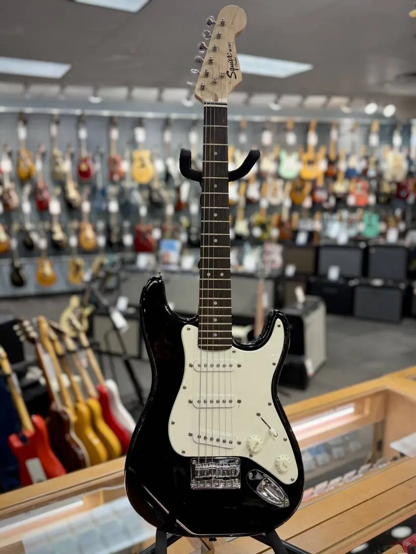 The Squier Mini guitar is the 3/4-size version (22.75" scale length) of the Squier Bullet guitar, and makes an ideal travel guitar for players of all ages or first guitar for kids. This is not a toy, though! Three single-coil pickups, a fixed non-tremolo hardtail bridge and five-way switching. Comes with Gig Bag as well!
