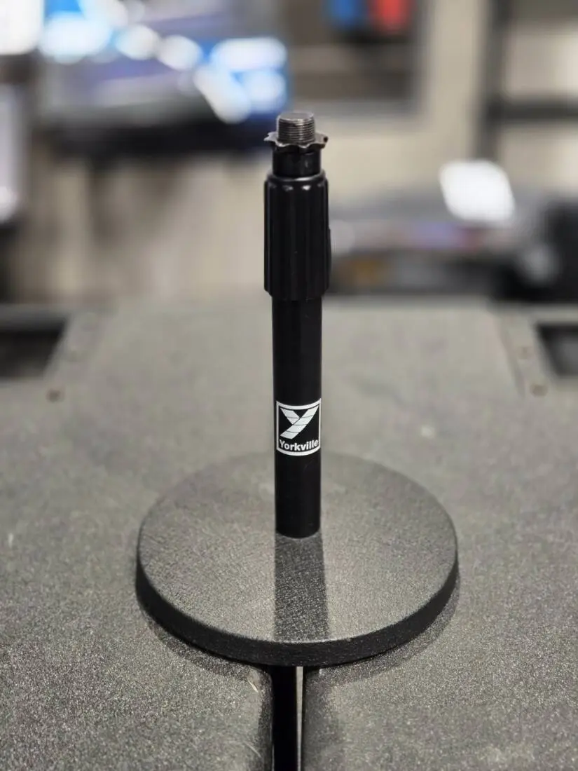 Round-base desktop microphone stand, height adjustable from 9" to 13", available in chrome or black finish. (shown in chrome)