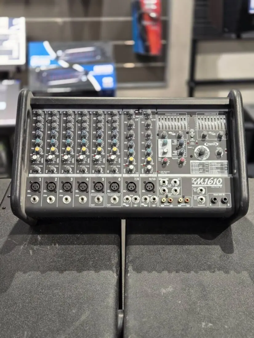 A uniquely angled control panel immediately sets the Canadian-made M1610-2 apart from its "box mixer" cousins and is your first clue that this is no ordinary mixer/amp. In fact the M1610-2 is possibly the most versatile and professional unit of its kind on the market in the 1600-Watt power range. Combining the convenience, lighter weight and small footprint of a box mixer with the tilt-back visibility and channel control access of a desk mixer helps to define the M1610-2 as something visibly more professional than the norm. As well, the M1610-2 can be rack-mounted with its optional RK1610 kit.
