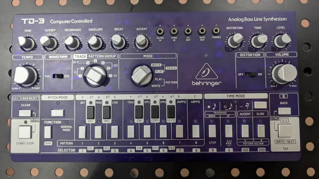 The Behringer TD-3-GP (Grape) is an affordable, analog bass line synthesizer and authentic clone of the classic Roland TB-303, designed for acid house and EDM. It features a pure analog signal path, matched transistors, a 4-pole resonant low-pass filter, a 16-step sequencer, built-in distortion, and a vibrant purple finish