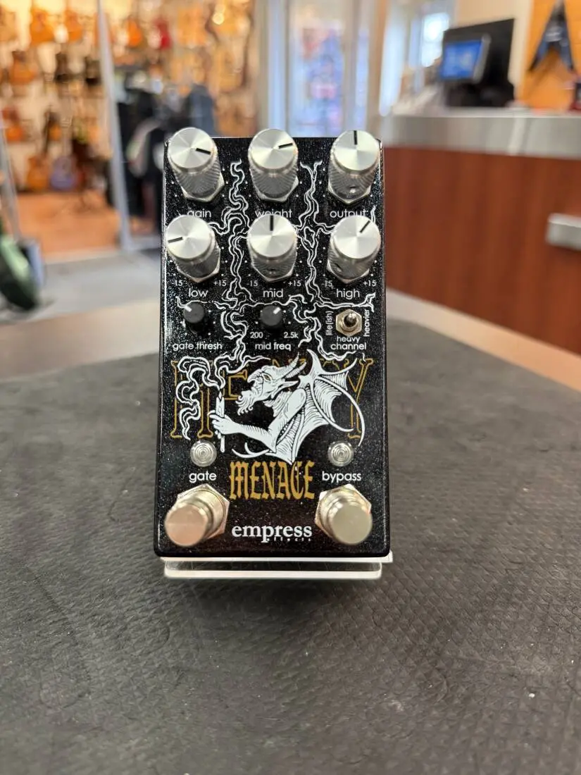 The Heavy Menace is an evolution of the Heavy distortion pedal in a compact enclosure. A new Lite(ish) mode joins the original Heavy and Heavier settings to cover everything from crunch to crushing. The three-band EQ features a sweepable midrange frequency, and the Weight control sculpts low frequency response for thick, full chords or tight palm muting. The footswitchable gate adapts to your playing, decaying naturally over sustained notes and clamping down during fast stops, with a key input for additional flexibility. However you get heavy, find your perfect sound with the Heavy Menace.