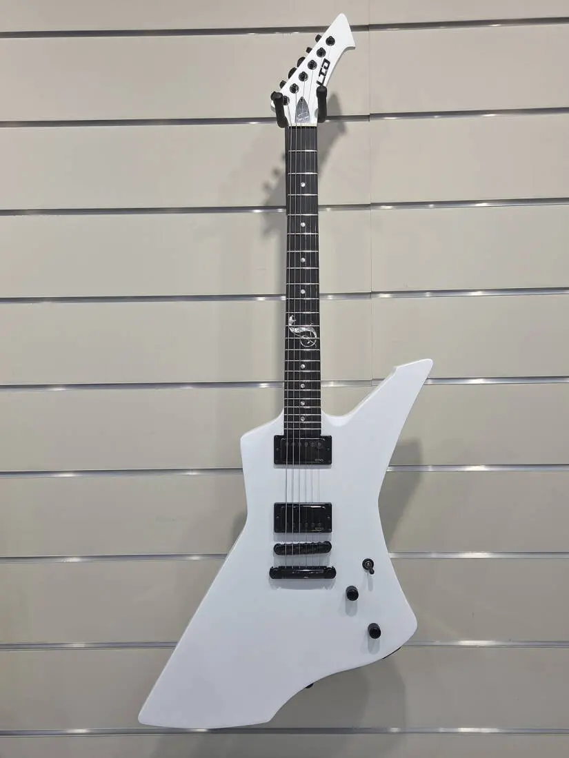 The LTD Snakebyte is a Signature Series model of James Hetfield, the frontman of Metallica and one of the world's most highly respected rhythm guitar players in any genre. The Snakebyte was created based on James' own original design. It features set-neck construction at 24.75" scale, with a mahogany body and a three-piece mahogany neck with ebony fingerboard and 22 extra-jumbo frets with a snake inlay at the 12th fret. The LTD Snakebyte is powered by James' own EMG JH SET active pickups, and includes a TonePros locking TOM bridge and tailpiece. Available in Snow White or Black Satin finishes, as well as in a lefthanded version