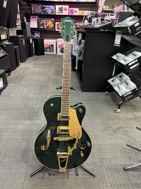 Draped in classic and stately Cadillac Green finish with all-gold hardware, this limited edition's premium features include dual Black Top Filter'Tron™ humbucking pickups, versatile upgraded controls including master volume treble bleed circuit, oversized bound F-holes and aged multi-ply body binding, smaller late-1950s G6120 bound headstock, secured Adjusto-Matic™ bridge with rosewood base, Graph Tech® NuBone® nut, pearloid Neo-Classic™ thumbnail fingerboard inlays, Bigsby® B60 vibrato tailpiece and G-arrow knobs.