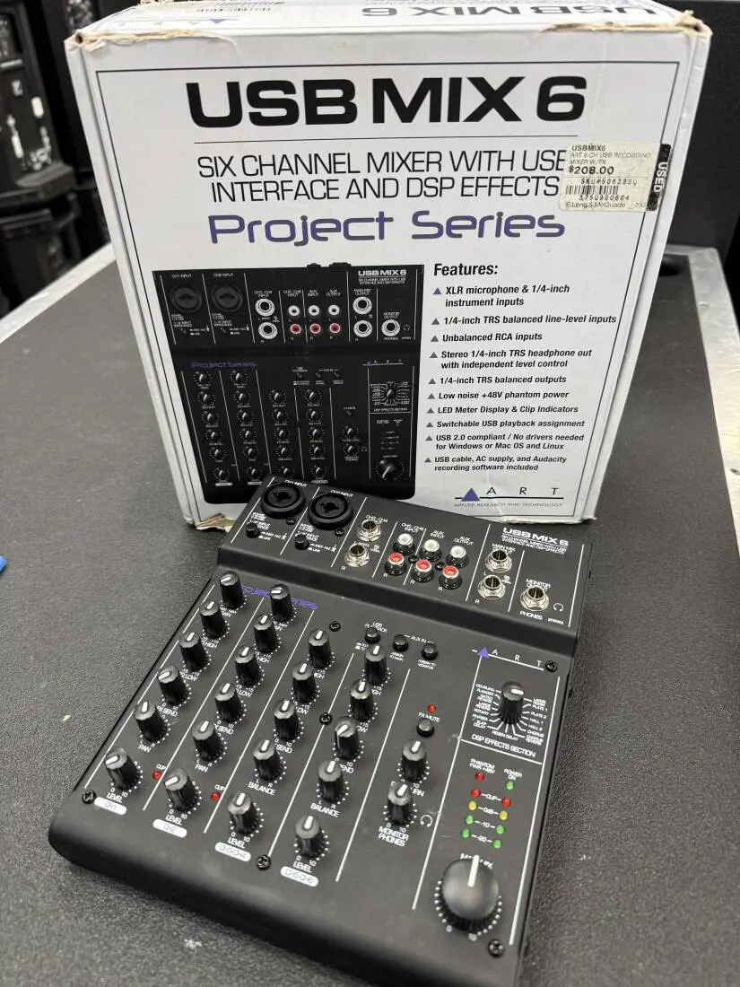 The ART USBMIX6 Microphone, Instrument, and Line Mixer / Computer Interface is a compact versatile audio interface for your computer that converts analog signals from a variety of audio sources to a digital audio. The built-in low latency stereo digital effects add to the versatility. It can also be used as a standalone mixer through the main mix outputs. The USBMIX6 provides a great starting point for personal home studio recording or for anyone wanting to do mobile location recording. Use the USBMIX6 to record podcasts, capture your latest idea for a song, make voiceovers for your home movies, or record a jam with a friend - whenever and wherever your creativity takes you!