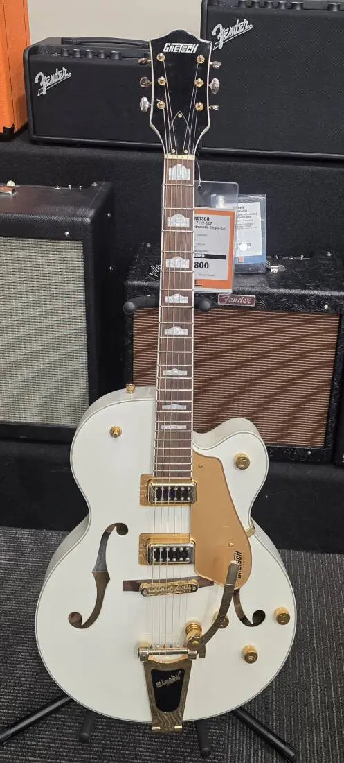 Alive and resonant, this G5427TG also features a versatile upgraded control layout including master volume with treble bleed circuit, master tone, individual pickup volume controls and threeposition tone switch, oversized bound F-holes, aged multi-ply body binding, smaller late-'50s G6120 bound headstock, Graph Tech® NuBone® nut, pearloid Neo-Classic™ thumbnail inlays, secured Adjusto-Matic™ bridge and Bigsby® B60 vibrato tailpiece. It's the sound of honor itself - play proud.