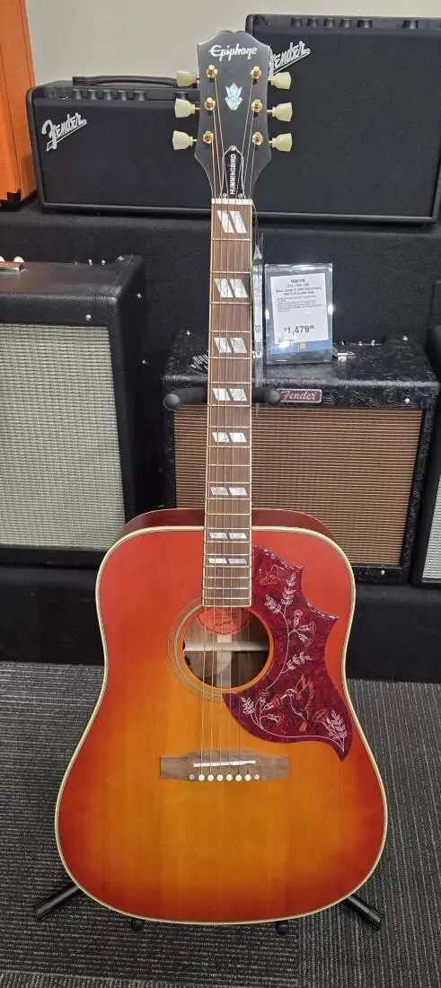 The Hummingbird™ is one of the most instantly-recognizable and remarkable acoustic guitars ever built. The new Epiphone Inspired by Gibson Hummingbird™ blends solid woods, vintage appointments and a Fishman Sonicore™ under-saddle pickup and Sonitone™ preamp. Outfitted with gold Epiphone Deluxe tuners, top and back multi-ply binding, Kalamazoo style headstock, and a bone nut and saddle.