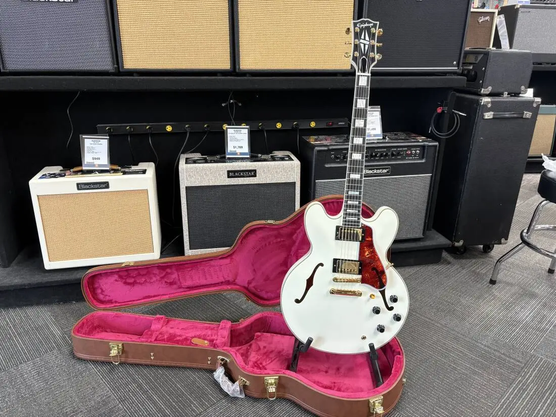 In partnership with Gibson Custom, Epiphone is proud to release the 1959 ES-355, a stunning recreation of the preeminent ES model from the legendary class of 1959. Its the top-of-the-line ES model in all its glory, from the dimensions to the contours to the precise inlay patterns and sonic experience.