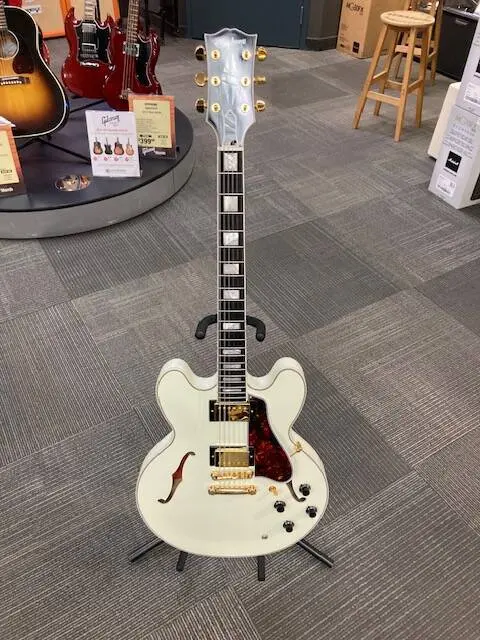 The 1959 ES-355 is powered by a pair of Gibson Custombuckers that are hand-wired to CTS potentiometers, Mallory capacitors,n and a Switchcraft pickup selector switch and output jack. A brown and pink hardshell case with the Inspired by Gibson Custom logo is also included.