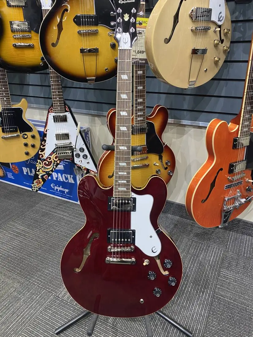 This is where it all started. During the early Oasis tours, Noel Gallagher played various Gibson and Epiphone guitars, but the early 80s Epiphone Rivieras really stood out. The look and sound of these instruments gave the ultimate live experience to those seeing the ultimate live rock 'n' roll band. Epiphone is honoured to welcome Noel Gallagher back to the core lineup with the Epiphone Noel Gallagher Riviera in stunning Dark Wine Red finish. With the original still in the artist's collection, Epiphone was granted access and, as a result, has included many historical elements with this new model. The colour and finish are a close match to original models from that era, while Epiphone Alnico Classic PRO pickups ensure the sound matches the looks. A Slim Taper neck is completed by the inclusion of a volute. Extra touches such as historically accurate "E" appointments on the pickguard and truss rod cover and a brown sound hole label give this guitar a vintage feel.