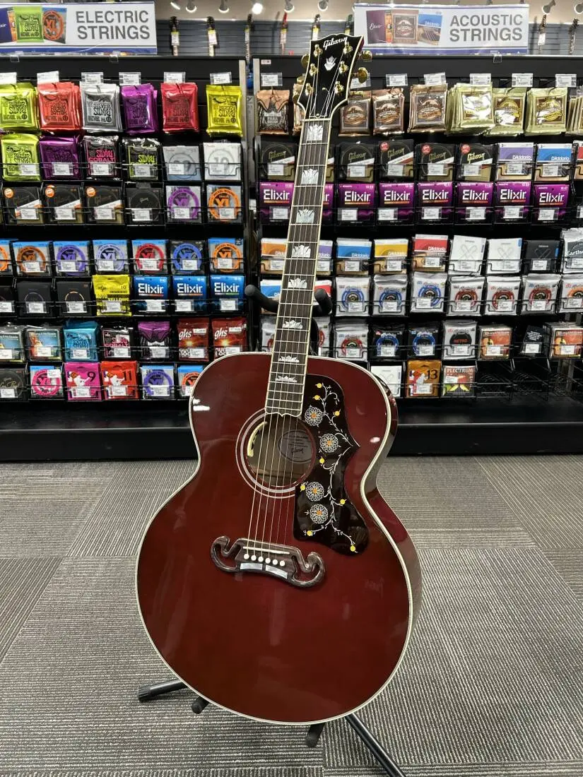 The legacy of Gibson's "King of the Flat-Tops" lives on in the SJ-200 Standard. From its inaugural appearance in 1937, Gibson's SJ-200 set an unmatched standard. The SJ-200 continues a legacy of the world's most famous acoustic guitar, and certainly one of the most popular. The body features flame maple and is finished in Wine Red. It comes equipped with gold Grover® Rotomatic® tuners, a TUSQ® nut, saddle, and bridge pins, and it is stage and studio-ready with an internal LR Baggs™ Anthem mic/pickup system. A Gibson hardshell case is included.