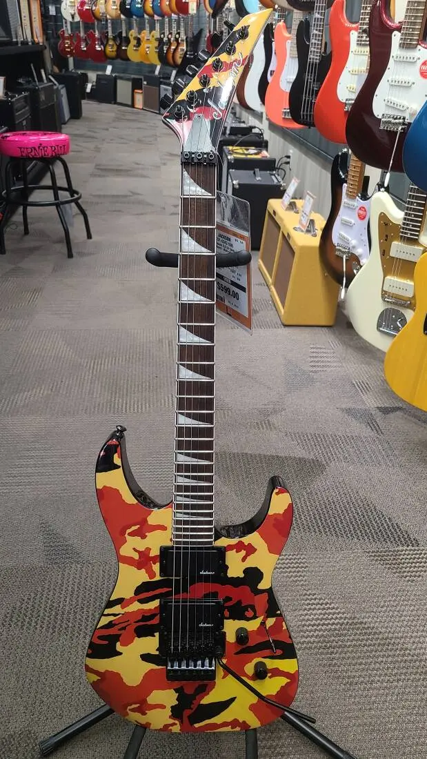 Active Jackson covered high-outputhumbucking pickups power this metal beast with an expansive voice loaded with crunchy, full-bodied tone ideal for brazen lead work or assertive rhythms runs. Tone is fully customizable with three-way pickup blade switching and single volume and tone controls, while a Floyd Rose® Special double-locking tremolo bridge system provides superior string stability and dynamic tremolo action.