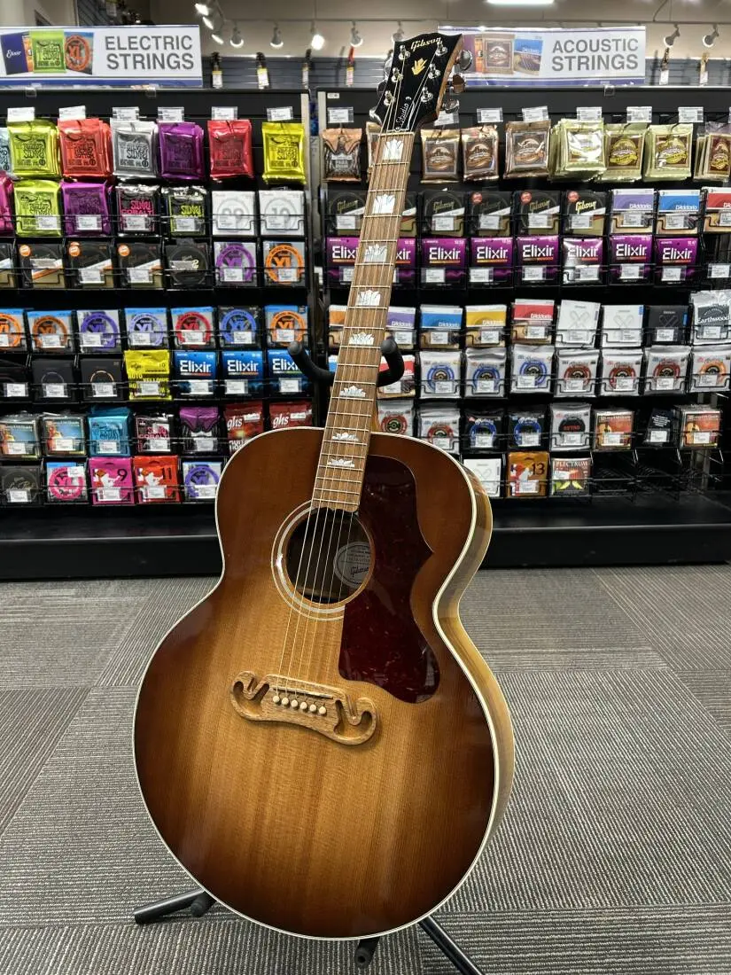 Hand built using beautiful Sitka spruce and walnut, this SJ-200 Studio is sure to please the eye and the ear. Utilizing Gibson's Advanced Response neck profile and slim body depth body design this is the most comfortable Super Jumbo they have ever built, without any sacrifice in tone. Outfitted with an active under-saddle piezo pickup for easy plug and play anywhere you perform.