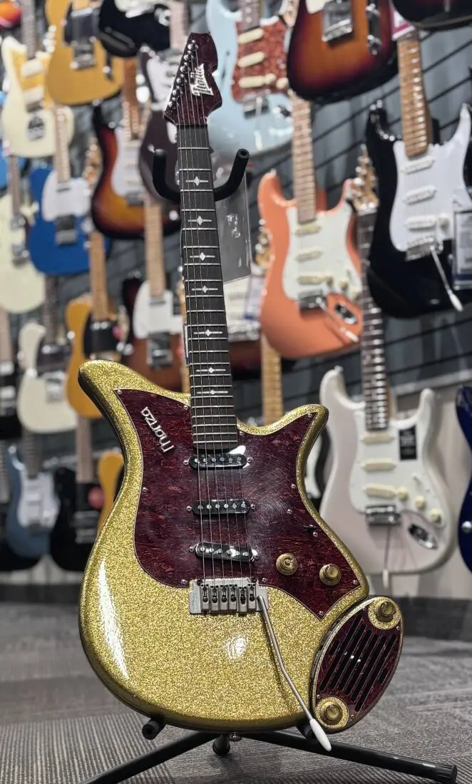 If you miss the sound of classic WKRP themes and don't want to have to use your feet on pedals just to play guitar, this 1999 Monza guitar and amp with a beautiful Gold Sparkle finish is for you.