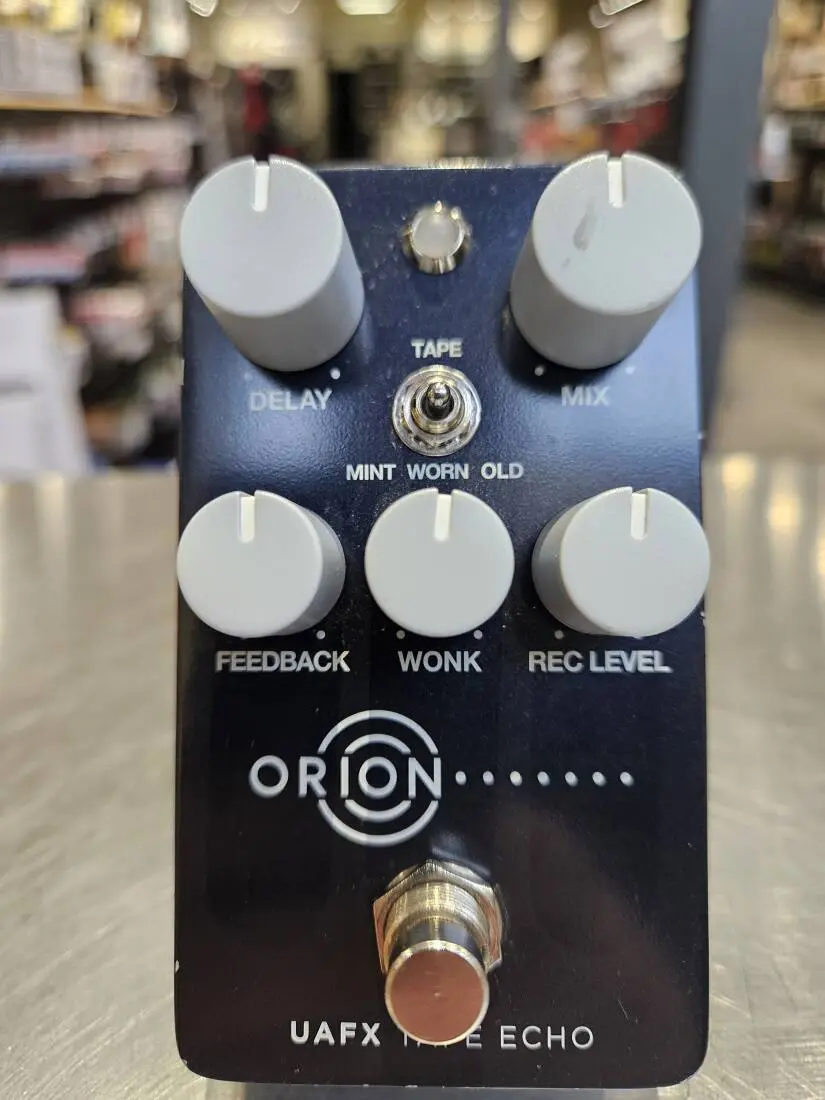 The UAFX Orion Tape Echo effects pedal features three vintage tape delay emulations, perfectly emulated analog preamp circuit and wow/flutter, true/buffered bypass, Preamp on/off, and analog dry through.