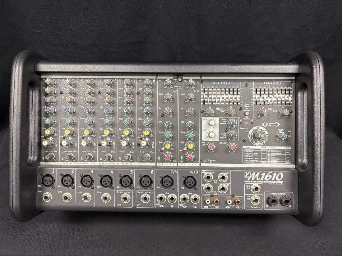 But it's innovative design technology, build quality, and an impressive list of features that really set this wedge mixer apart. High-output, lightweight class-H power amplifiers, newly designed input strips, an on-board effects DSP, a truly effective master EQ section and ten versatile input channels all add to the impressive list of M1610-2 attributes. And there's a lot more.