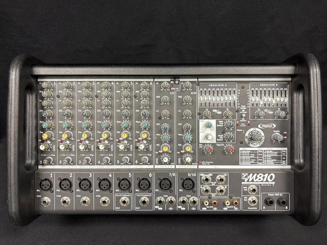 The 800-watt M810-2 has two integrated 400-watt power amplifiers that can be assigned as stereo mains, or mono main and mono monitor. Each amplifier is attached to an innovative master EQ section designed specifically for these new mixers. The master EQ has a 9-band graphic EQ with additional high and low shelving EQ's at either end of the frequency band. The nine graphic sliders are essentially all of the middle bands of a 15-band graphic EQ with the low and high frequency bands covered by separate shelving controls. This gives the user more control over the feedback-prone mid frequency bands; with high and low tone-shaping frequencies controlled by additional simple +/- 15 dB trim controls.