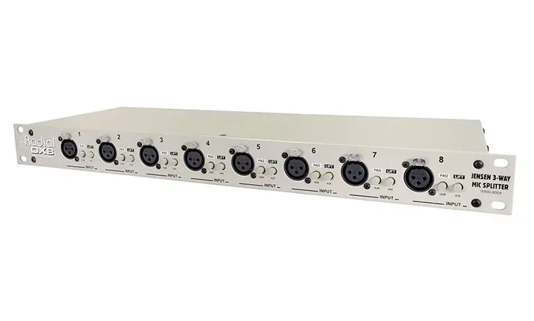 The Radial OX8 is a professional audio tool that is equally at home on a live stage as it is in a broadcast studio, splitting eight microphone signals to multiple destinations simultaneously without noise or distortion, and eliminating hum and buzz from ground loops. Each channel is configured with a balanced input, a direct out which also serves as a return path for 48V phantom power, a thru-put with a ground lift switch, and a fully transformer-isolated output. The OX8 may be ordered with premium Jensen JT-MB-CPC transformers or Eclipse ET-MS10 transformers as an affordable alternative. Each channel also benefits from an ultra-short signal path and built in RF filters to ensure absolute quiet performance even in the most noise-prone environments.
