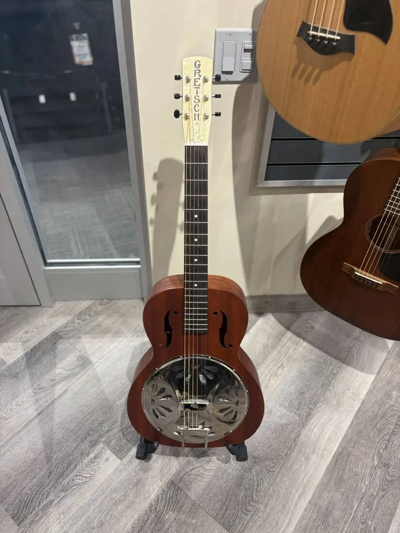 The miracle of volume! With its mahogany "long-body" design and comfortable "soft V"-shaped neck, this faithful reissue of the 1930s classic sounds and plays like a million bucks. The vital feature of all Gretsch resonator guitars is the Gretsch Ampli-Sonic diaphragm (resonator cone), which is hand-spun in Eastern Europe from nearly 99 percent pure aluminum, yielding an impressive quality and volume of tone.