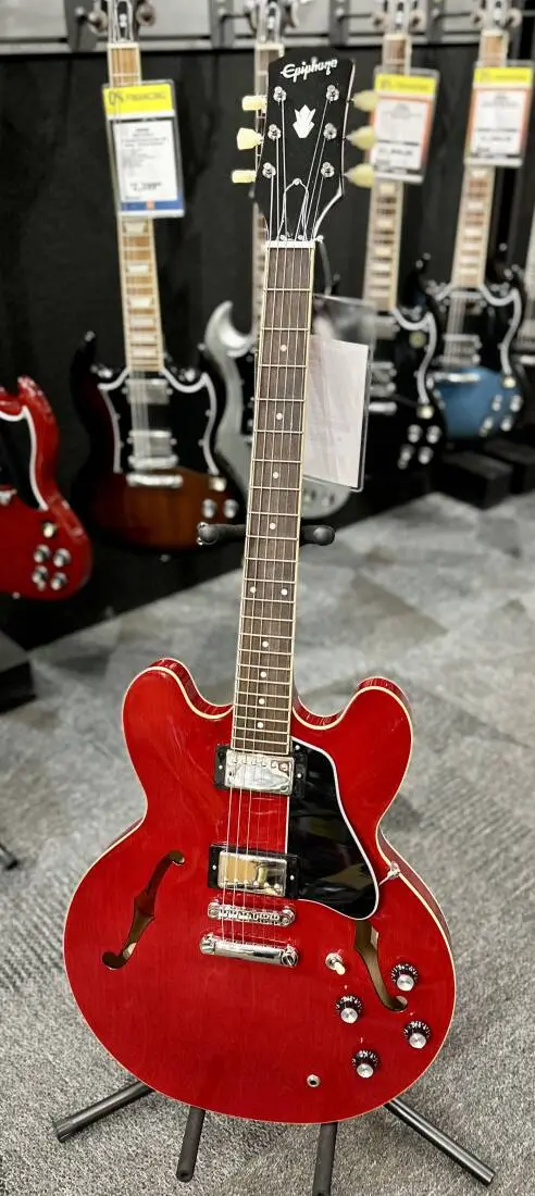 The ES-335 is Epiphone's version of the historic ES-335 that has been wowing guitar players all over the world for over six decades. From its inaugural appearance in 1958, the Gibson™ ES-335 set an unmatched standard. This Epiphone ES-335 is no exception. It is simply one of the best deals today for guitar players who want the classic sound of an ES-335 at an accessible price. The ES-335 is crafted with a layered maple top, back, and sides coupled with a solid maple tone block to create the amazing sustain, warmth, and resonant tone that players crave in a semi-hollow instrument. Epiphone's Alnico Classic PRO™ Humbuckers deliver a wide range of vintage sounds while the rounded C neck profile is extremely comfortable and easy to play, and the headstock features the 60s style Kalamazoo shape.