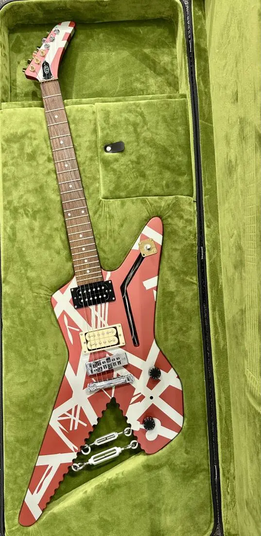 In addition to its instantly recognizable Burgundy with Silver Stripes paint job, the Shark boasts other eye-catching features including black numbered speed knobs, three-way toggle switch housed on a brass mounting plate, brass nut, gold and chrome custom EVH-stamped Gotoh® tuners and chrome eye hooks with turnbuckles.
