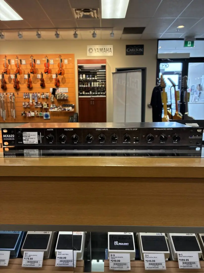 The MX622 is a versatile mixer combining three balanced microphone or line level inputs with three stereo line inputs into a single stereo line level mix. Essential features include external effects loop (mono send with stereo return), independent stereo record outputs, stereo TRS 1/4-inch balanced outputs and full range master two-band equalizer. The internal power supply and single rack-space 19-inch rack mount format allows for easy installation and reliable long-term operation.