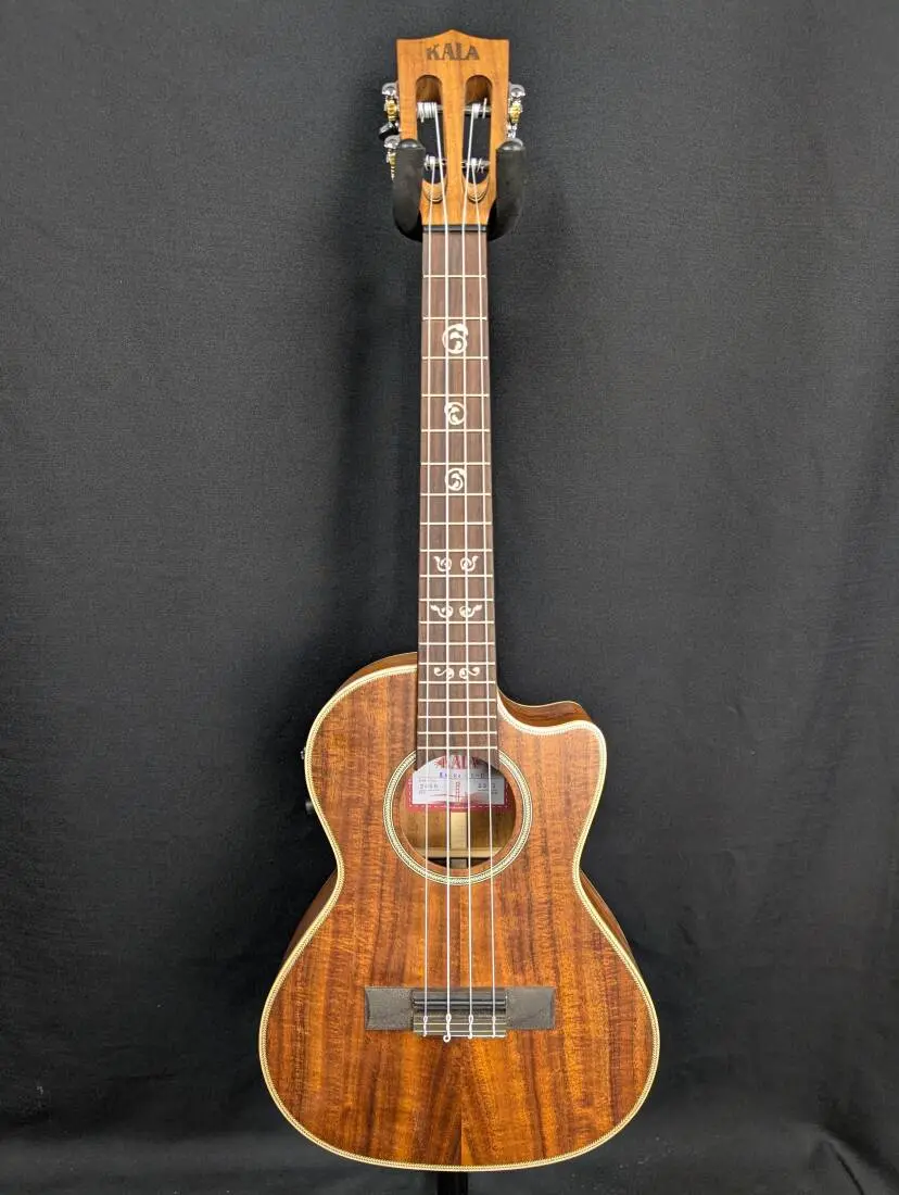 The Solid Acacia Tenor is now available with a cutaway and a Fishman® Kula preamp. The Solid Acacia line bears a beautiful, figured grain pattern that is similar to its close relative Koa. The tone of Acacia is also similar to its cousin Koa, providing clarity, warmth, and a midrange focus. Kala added Maple binding, herringbone rosette, and a venetian cutaway for decorative effect, all wrapped up in a satin finish.