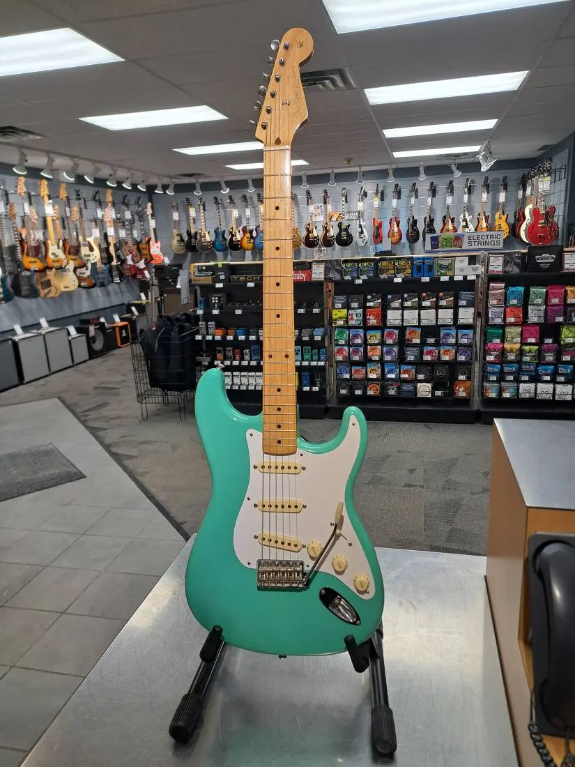 For authentic, vintage-style tone Fender recreated the trio of single-coil Stratocaster pickups to sound more like the originals. Crystalline and bell-like, they have the crisp, articulate tone that put Fender on the musical map. The updated "Soft V"-shaped neck has a 7.25"-radius maple fingerboard with 21 vintage-style frets for classic playing feel. A vintage-style, six-point synchronized tremolo and vintage-style tuning machines provide original-era aesthetics, rock-solid performance and tuning stability.