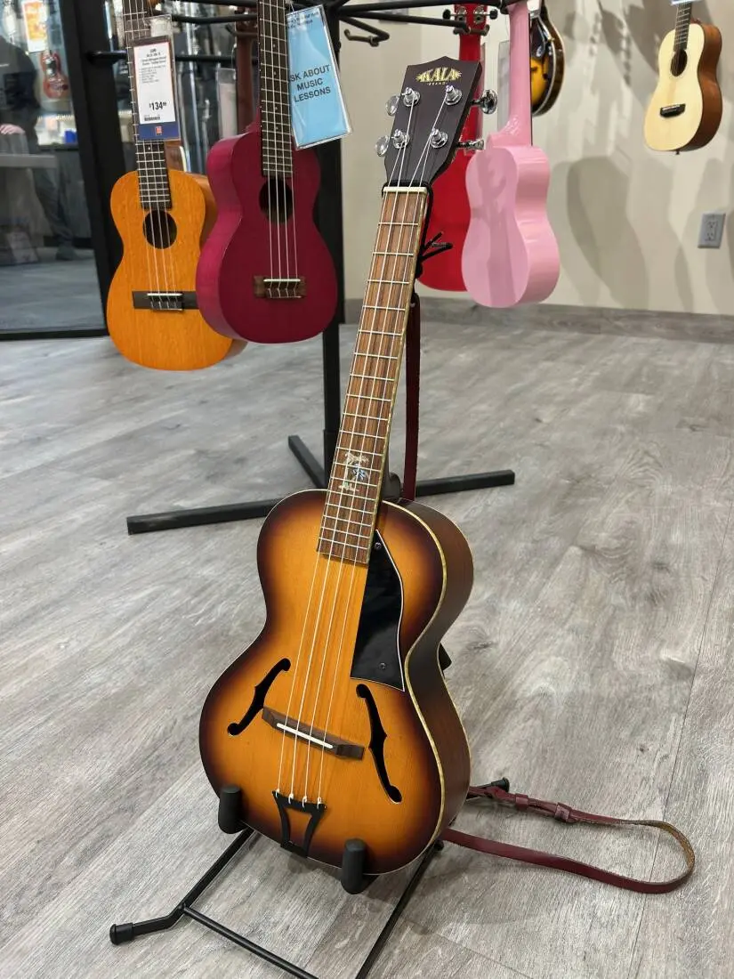 The Kala KA-JTE-HB Tenor Archtop Ukulele is an unique instrument that's sure to draw a crowd wherever you play it. This Tenor spruce-topped uke has a Mahogany back and neck, with a smooth Rosewood fingerboard for warm, complex overtones. The combination of premium tonewoods and expert craftsmanship result in a overall full and rich sound. This ukulele is complete with the Shadow EQ JW1 active pickup system with independent volume and tone controls, adding versatility for live performances.