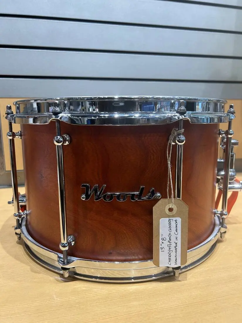 A versatile and articulate custom snare. This 10-ply cherry/poplar/cherry 13x8 snare from British Columbia's Jeff Woods at Woods Custom Drums delivers a great balance of depth, punch, and sensitivity. The 10-ply cherry/poplar/cherry shell offers a warm, focused tone with a nice blend of body and projection—plenty of low-end from the deeper shell, while the 13" diameter keeps things tight and responsive.