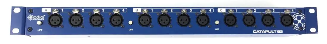 The Catapult Rack units operate like three modules in one chassis. Since each Cat 5 Ethernet cable can carry four channels, the 12 XLRs on each Catapult Rack are split into three banks, each with their own noise-eliminating ground lift switch and RJ45 Ethernet jacks on the rear panel. You can use three Ethernet cables to connect all 12 channels to a single location or split them off to any of the Radial Catapult stage boxes, providing you with a fully customizable audio snake systems.