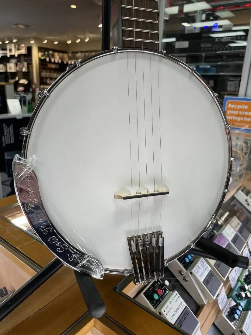 The Cripple Creek CC-50 is an entry-level 5-string banjo designed for easy learning, specifically designed to play effortlessly, sound great and be affordable. The openback CC-50 is ideal for "old time" or folk-style banjo playing. The hard maple neck and maple rim, guitar-style tuners, geared fifth-string tuning peg, single coordinator rod, straight-line tailpiece, ovangkol fingerboard and rolled brass tone ring combine to make a lightweight, all-wood instrument that's ideal for the student or for experienced picker in need of a second banjo. Completely set up at the Gold Tone factory in Florida, the CC-50 includes a gig bag for easy transport.