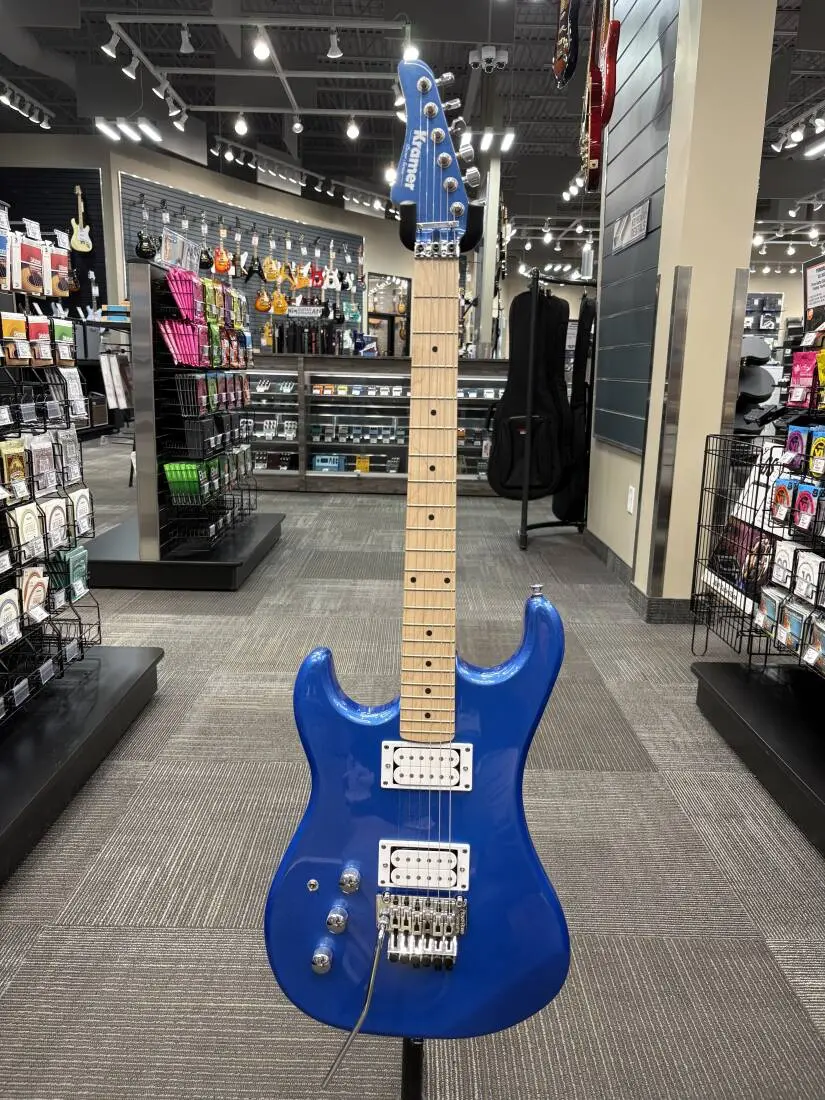 The Pacer Classic is part of Kramer's Original Collection and is a superb tribute to the original 1982 Kramer that knocked the guitar world for a loop. The Pacer Classic is built for speed, with a 25.5" scale maple neck with a Kramer K-Speed SlimTaper™ C profile and 22 medium jumbo frets. The Pacer Classic has chrome hardware, an alder double-cutaway body, a pair of double white, open-coil Alnico Classic 5 humbuckers™, and a licensed Floyd Rose® Tremolo bridge and R2 Locking Nut. Available in Radio Blue Metallic, Scarlet Red Metallic, and Purple Passion Metallic