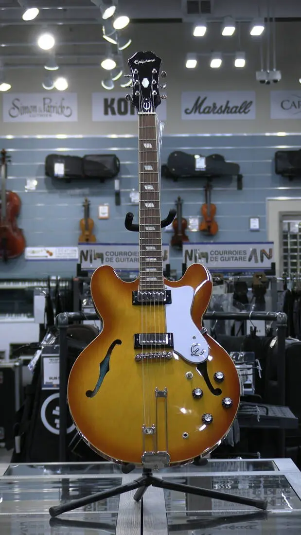 The Epiphone Riviera, one of Epiphone's original, most enduring classics makes a comeback! First introduced in the early 60s, the Epiphone Riviera's semi-hollow design has been a favourite of players from all genres and generations including blues greats Robben Ford and Otis Rush, Lou Reed of the Velvet Underground, and The Strokes' Nick Valensi, who have all found that the Riviera's legendary ES™ body shape can produce great tones with any pickup variation. This Riviera features a layered maple top back and sides, a 3-layer pickguard with the classic metal Epiphone E, and comes equipped with Epiphone's LockTone™ Tune-O-Matic™ adjustable bridge and Frequensator tailpiece. Available in Royal Tan and Sparkling Burgundy full gloss finishes.