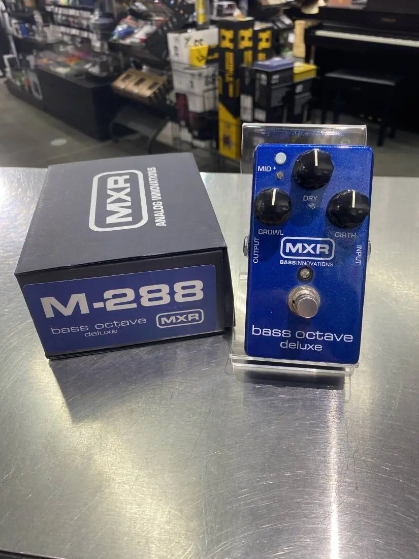 MXR M288 Bass Octave Deluxe The M288 Bass Octave Deluxe is a dual-voice octave pedal from MXR Bass Innovations that offers organic analog tone, true bypass, and a wide variety of tone-shaping options. Powered by a single 9-volt battery, MXR's 18-volt Constant Headroom Technology (CHT) provides studio-performance headroom and superior tracking. Use the Dry knob to mix your direct bass signal with the octave effect, or hit the Mid+ switch to add up to +14dB of internally adjustable low-mid punch (400Hz) or midrange pop (850Hz). Bass players will love the two separately processed and individually voiced octave controls-Growl (for throaty, midrange octave-below tone) and Girth (for deep and smooth octave below). The Bass Octave Deluxe comes in a durable, lightweight aluminum casting and has the same high-quality jacks and switches that have made MXR pedals the road-ready standard on pedal-boards around the world for over 30 years.