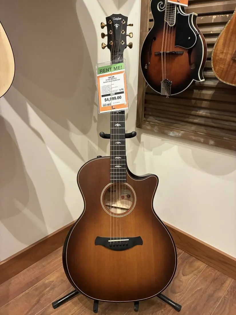 The V-Class architecture improves the volume, sustain and projection, and creates more harmonic agreement between notes by putting the top more in tune with the strings. Using their proprietary roasting process for the Sitka spruce top lowers the damping effect and helps deliver a more played-in tone. Ergonomic body details (exclusive to Builder's Edition) include a beveled armrest with beveled body edge treatment; a double-carved cutaway that allows fluid access to the higher frets without the need to change one's hand position; and a new Silent Satin finish, which reduces contact noise for a cleaner overall sound. Gold Gotoh 510 tuners (featuring a 21:1 gear ratio) complete the suite of tactile delights. Striking aesthetic details include a new Wild Honey Burst on the back, sides and neck, mother-of-pearl Sceptor fretboard/peghead inlay, and inset maple/black body purfling with matching rosette. The guitar comes equipped with Taylor ES2 electronics and ships in a deluxe hardshell case.