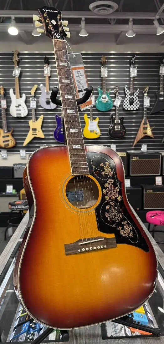 The Masterbilt Series presents a recreation of the rare Epiphone Frontier. Featuring a Solid Sitka Spruce top with the iconic "Rope and Cactus" pickguard, bone nut, and the state-of-the-art Fishman™ Sonitone™ Onboard Preamp System for true acoustic tone when plugged in. Available in Ice Tea Aged Gloss finish. Featuring Gibson Strings.