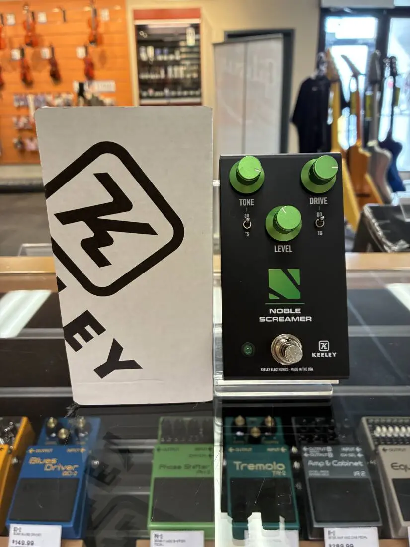 Imagine being able to combine your favourite parts of different overdrive & boost pedals in order to create hybrid sounds no one has ever played through before. That is exactly what the Noble Screamer has been engineered for. It's a 4-in-1 pedal that gives you two very familiar drive circuits and two brand new amp-like distortion tones that no one has used before. It's almost like pedal-modeling, except these are 100% analog circuits, and you decide which tone-control or clipping-section you want to play through. You can play through battle-tested, classic overdrive effects or innovate new music with hybrid tones, let your ears be the judge. Even with all of these features the pedal remains a simple and easy to use three knob overdrive. The innovation in the Noble Screamer doesn't end there; this new design features true-bypass or buffered, truly silent switching, on the fly. The Keeley Noble Screamer Overdrive and Boost is entirely manufactured at Keeley Electronics and is the first in the newly designed aluminum enclosure.