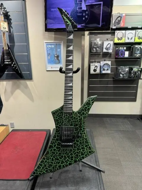 As distinctive as its namesake, the Pro Series Signature Brandon Ellis Kelly™ comes in a distinct Green Crackle finish with reverse pointed 6-in-line black headstock with green Jackson logo and black hardware.