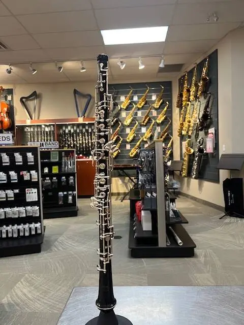 High quality plastic resin body. Bore hand reamed and finished by Fox craftsmen. Silver plated posts, bands, and bell ring. Stainless steel arbors and wire springs. Nickel silver keys with nickel silver hinge tubing and heavy silver plating. Handmade modified conservatory mechanism including left hand F, alternate C, and articulated C(sharp), with the exception of the split ring E(flat)-E trill key, A(flat)-B(flat) adjustment mechanism, 3rd octave key, and low B(flat) vent key. Cork pads on low C and above, F(sharp) key tab, Teflon tipped stainless steel adjusting screws.
